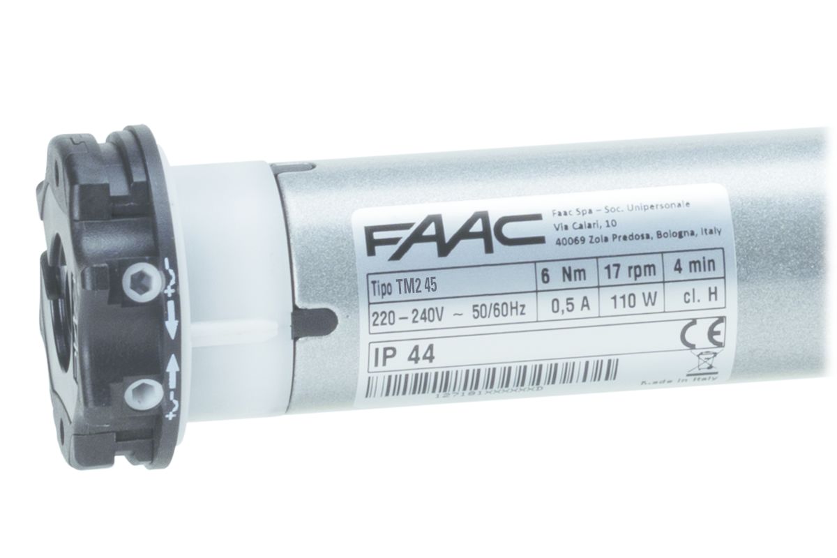 Die mechanischen Antriebe der Marke FAAC zeichnen sich durch eine einfache und genaue Endlageneinstellung mittels Stellschrauben am Motorkopf aus. Die Antriebe der Baureihe TM2 45 haben einen Rohrdurchmesser von 45 mm und sind in mit Drehmomenten von 6 Nm bis 50 Nm in den Stufen 6 Nm, 10 Nm, 15 Nm, 25 Nm, 30 Nm, 40 Nm und 50 Nm erhältlich. Eine parallelschaltung der Antriebe ist ohne Trennrelais nicht möglich. Diese neuen TM2 Antriebe sind die Nachfolger der altron Black und FAAC TM Motoren.