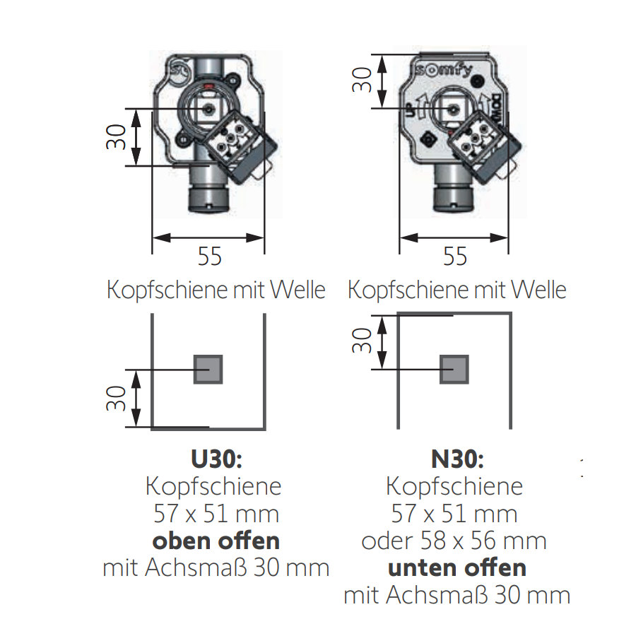 Die U30 Kits eignen sich für Systeme mit Kopfschiene oben offen, mit Wendelager-Achsmaß 30 mm und sind zusätzlich mit einer verschraubten Kabelführung ausgestattet. Für alle Raffstorentypen geeignet, dank 4 Funktionsweisen.