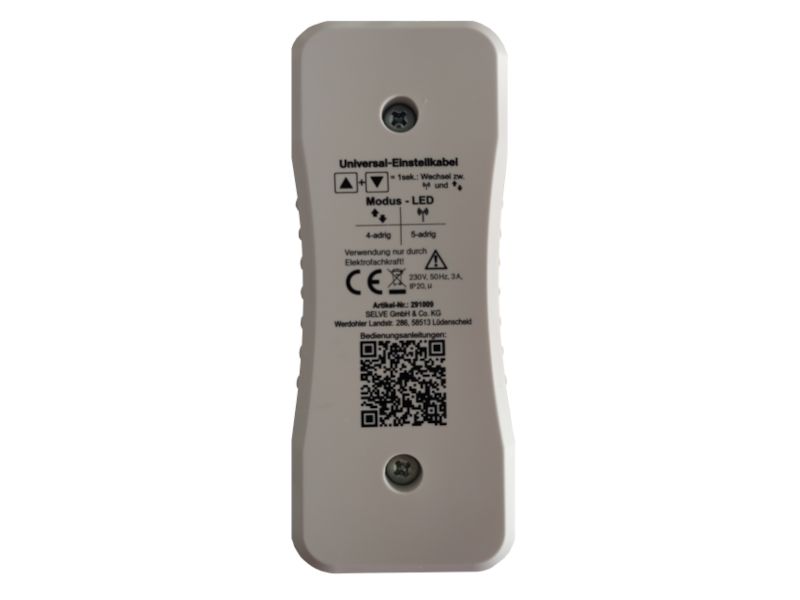Das Universal-Einstellkabel ermöglicht durch das Umschalten der Betriebsart ein farbgleiches Anschließen der Motoranschlussleitung von leitungsgebundenen SELVE-Antrieben (4-adrig) und SELVE-Antrieben mit Funk bzw. SMI (5-adrig). Der gewünschte Modus wird durch gleichzeitiges drücken der „AUF“ und „AB“ Tasten eingestellt. SELVE GmbH & Co. KGWerdohler Landstraße 286