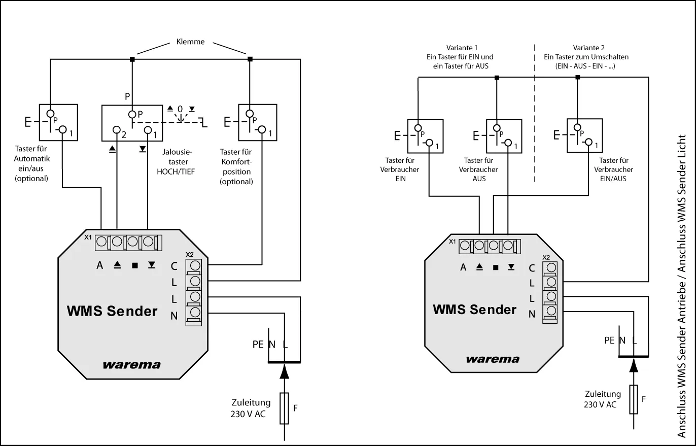 - wandelt die Tastimpulse eines konventionellen 230 V-Tasters in WMS Signale zur Fernsteuerung von WMS Empfängern um